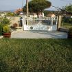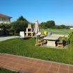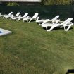 La casa cuenta con un amplio jardín, con tumbonas y mesas y sillas para comer en el jardín.