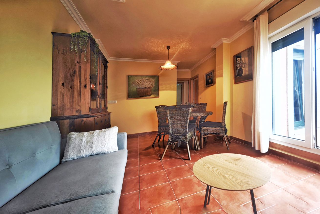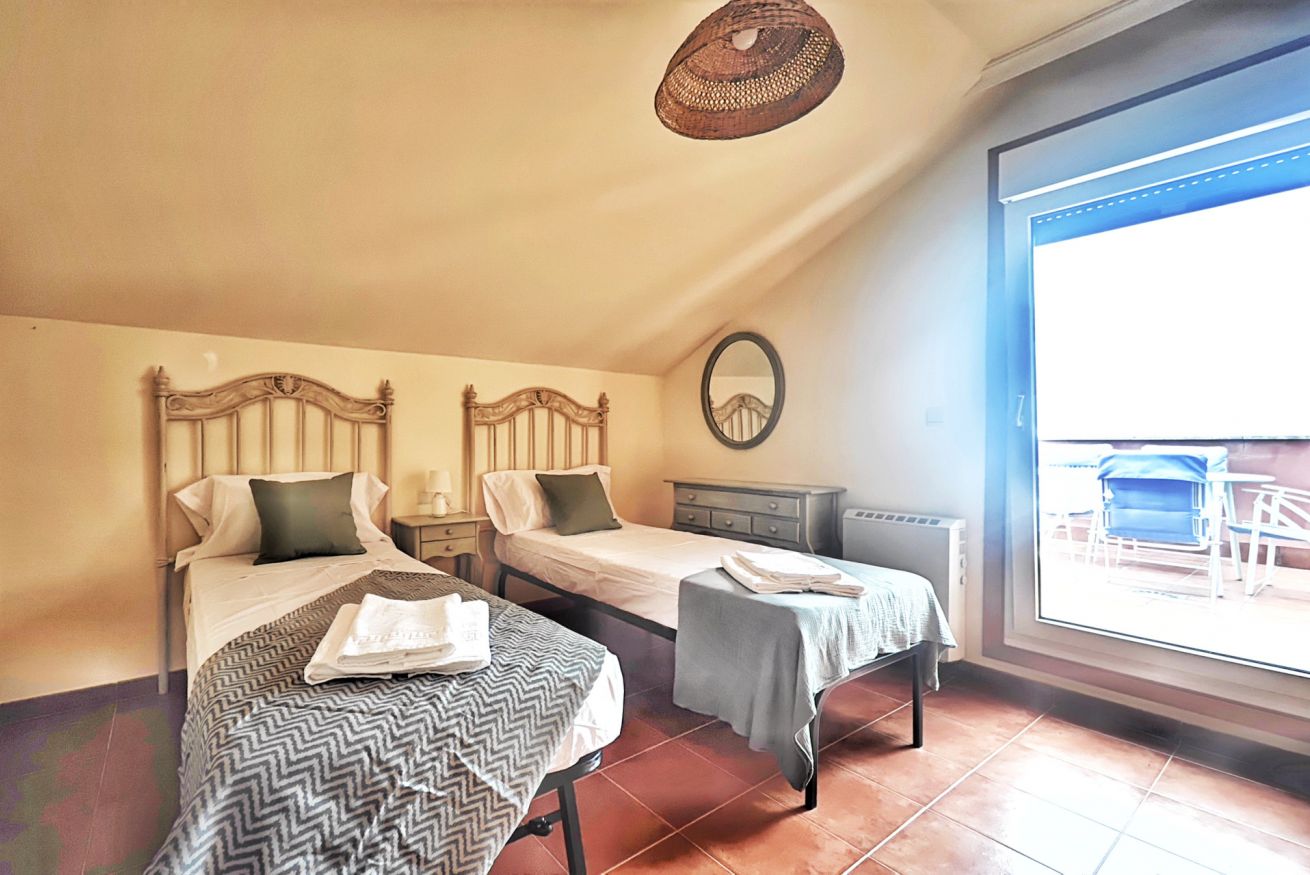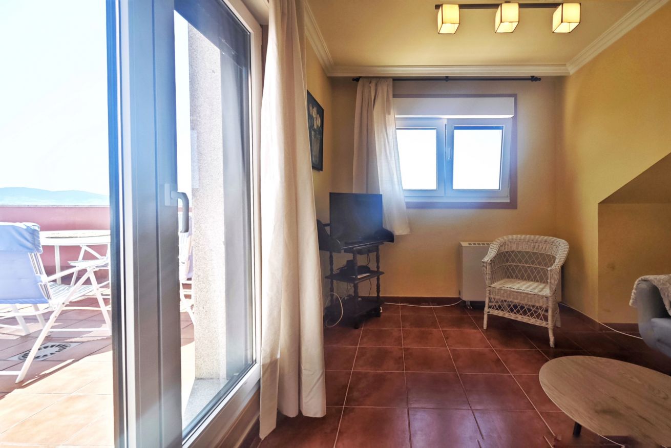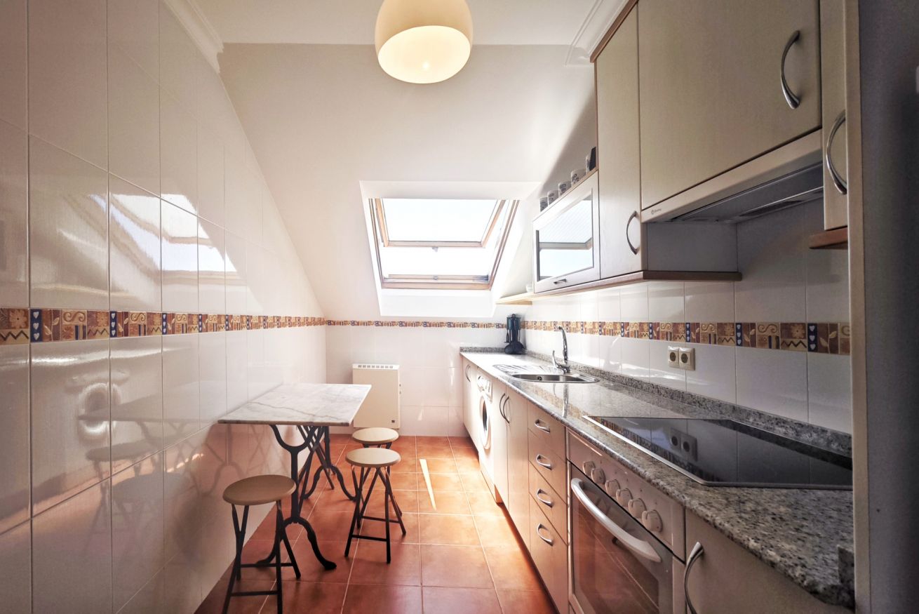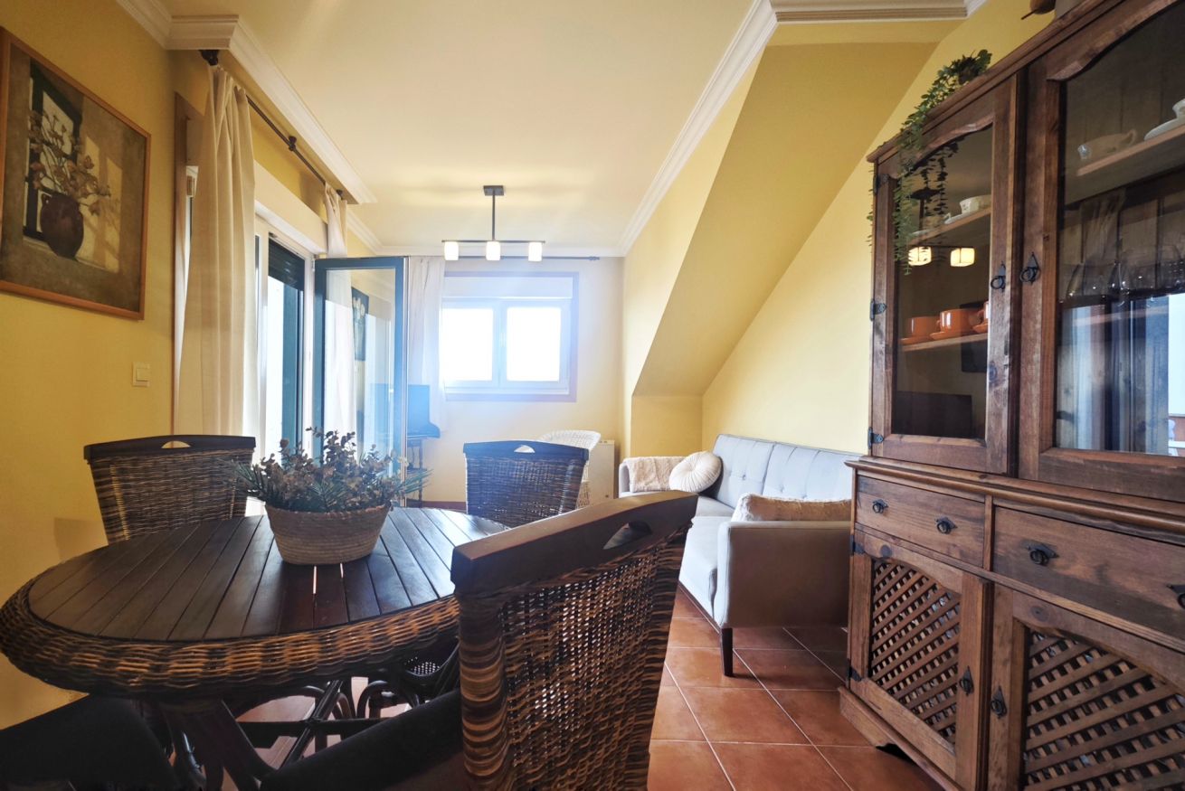 El interior del ático incluye un amplio salón-comedor que se conecta a la terraza a través de una puerta, una cocina completamente equipada y dos acogedores dormitorios: uno con una cama grande y el otro con dos camas individuales. Además, dispone de dos baños completos y una plaza de parking en el propio edificio.