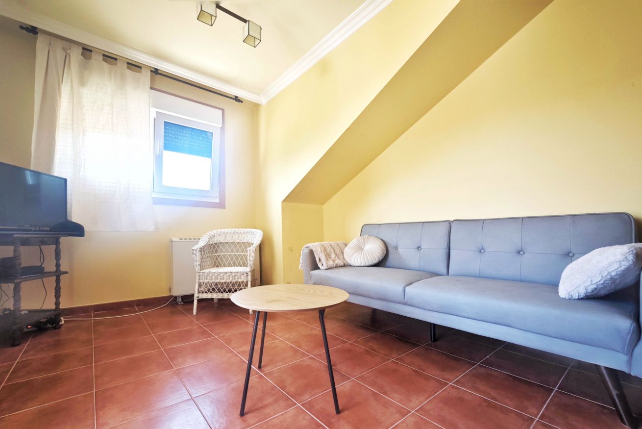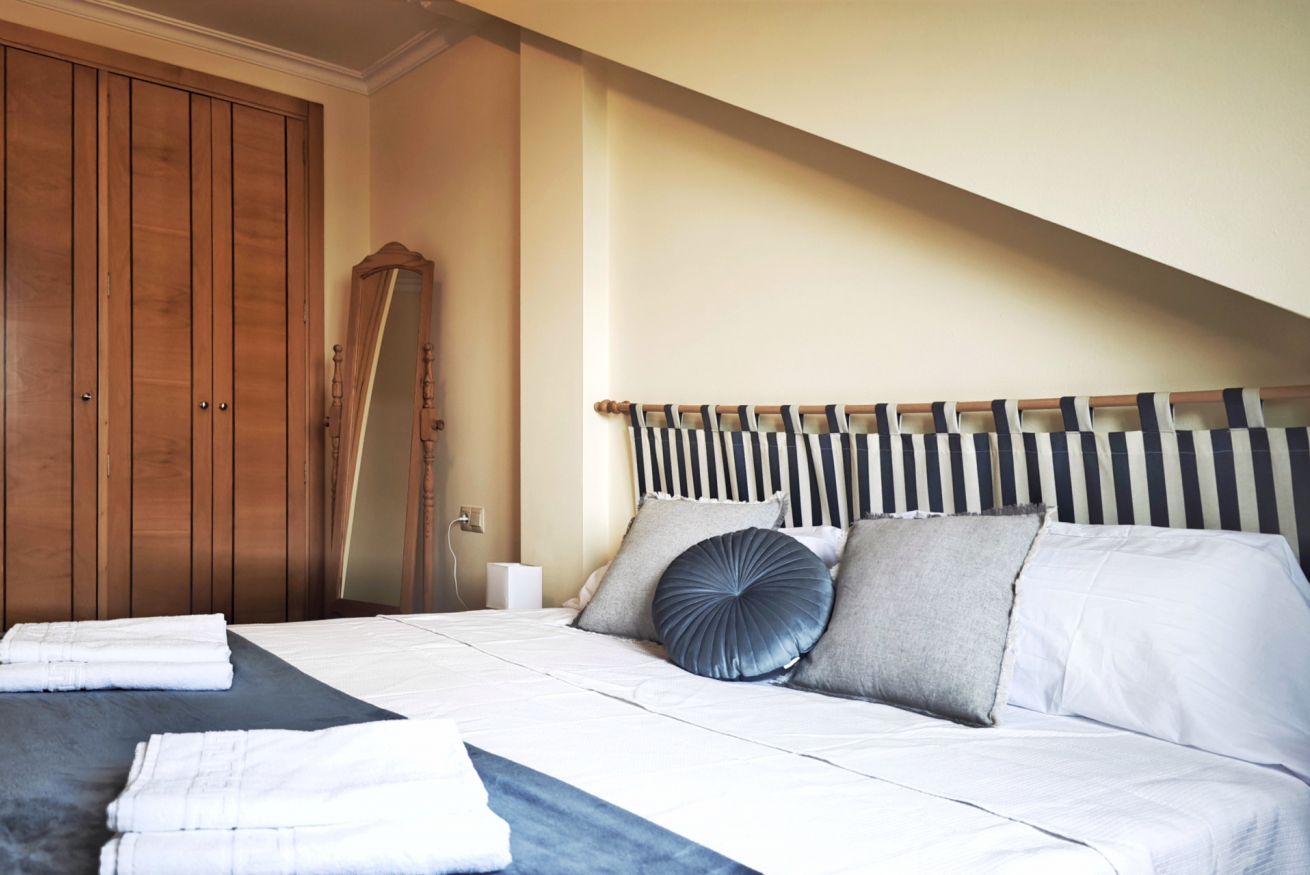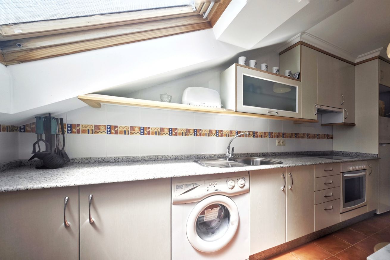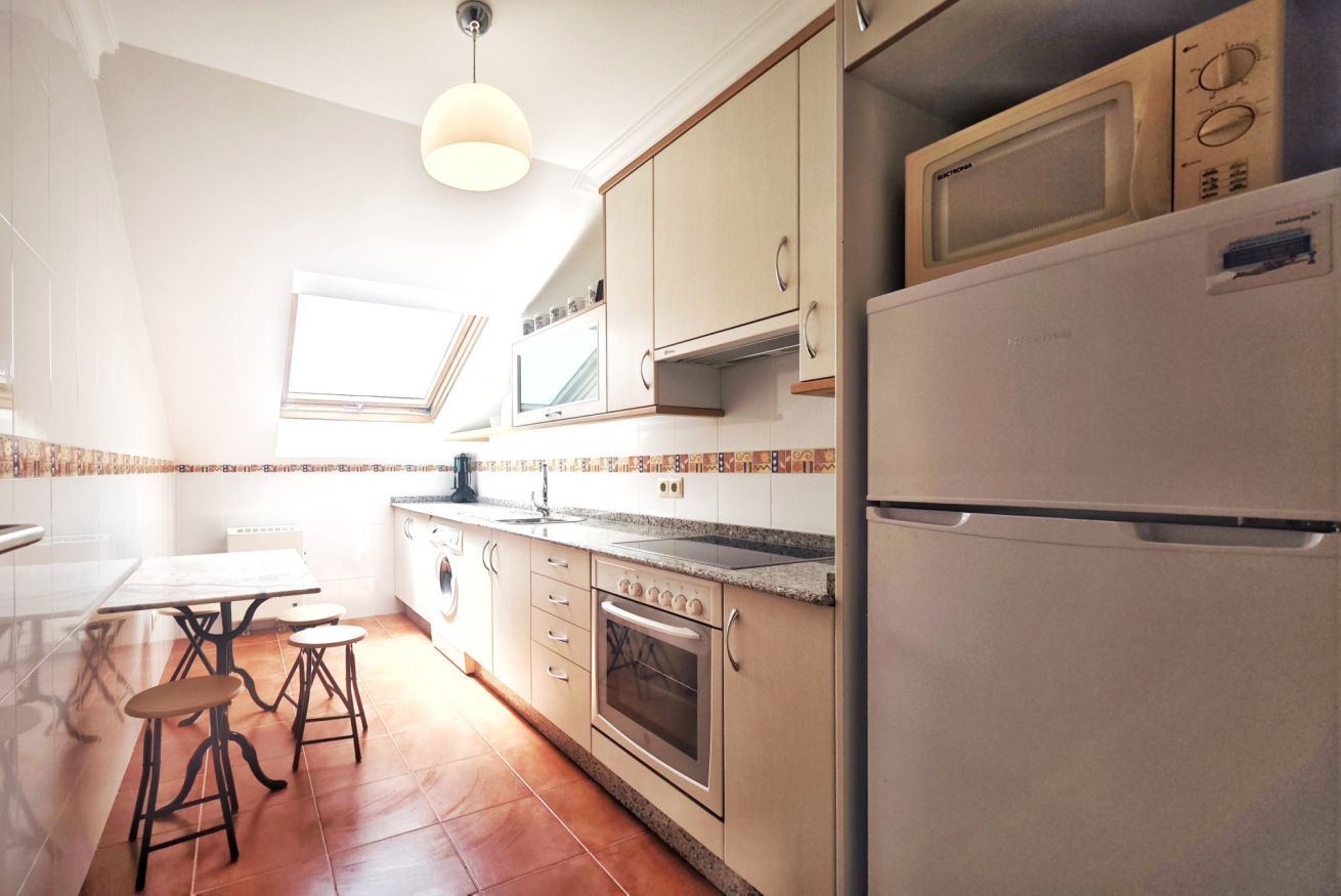 El interior del ático incluye un amplio salón-comedor que se conecta a la terraza a través de una puerta, una cocina completamente equipada y dos acogedores dormitorios: uno con una cama grande y el otro con dos camas individuales. Además, dispone de dos baños completos y una plaza de parking en el propio edificio.