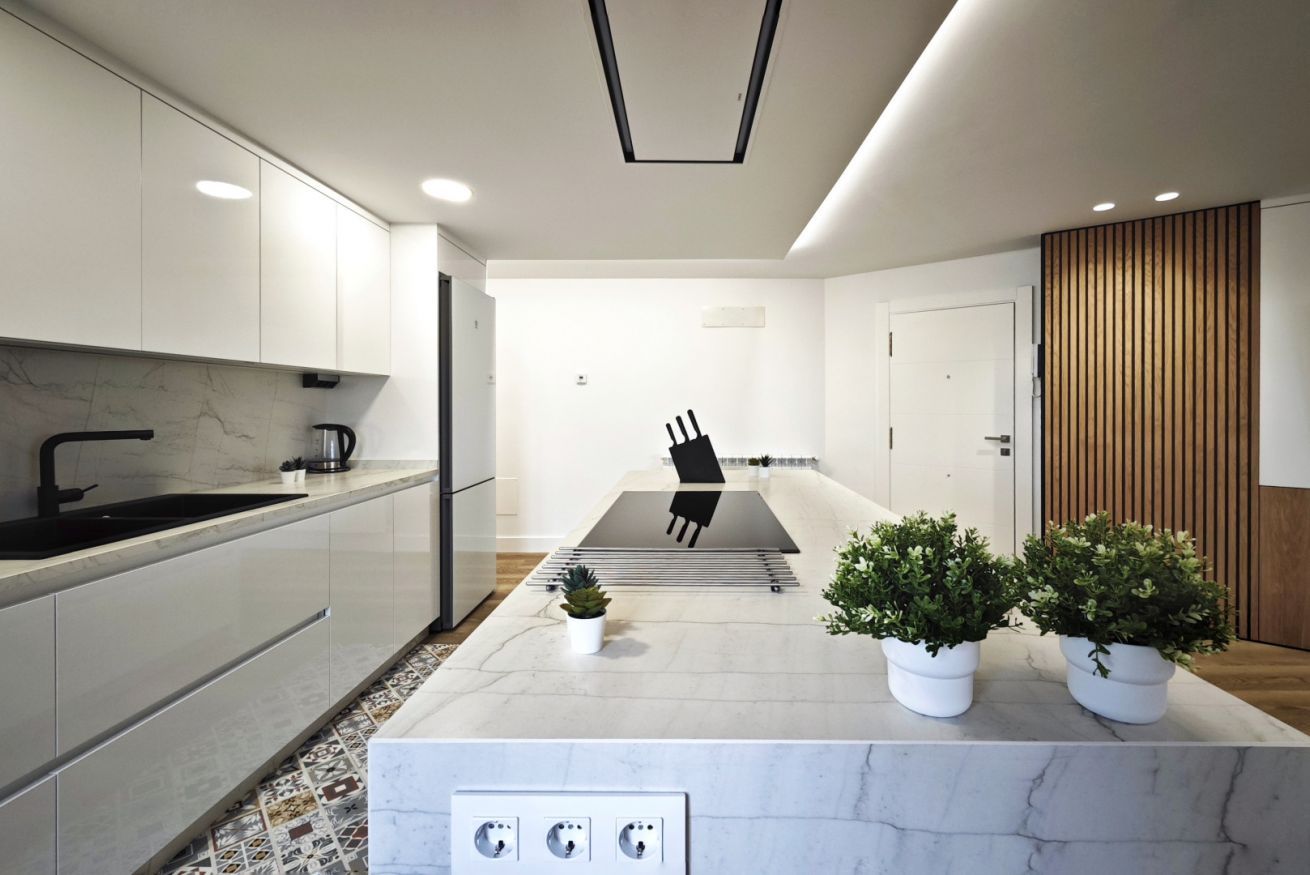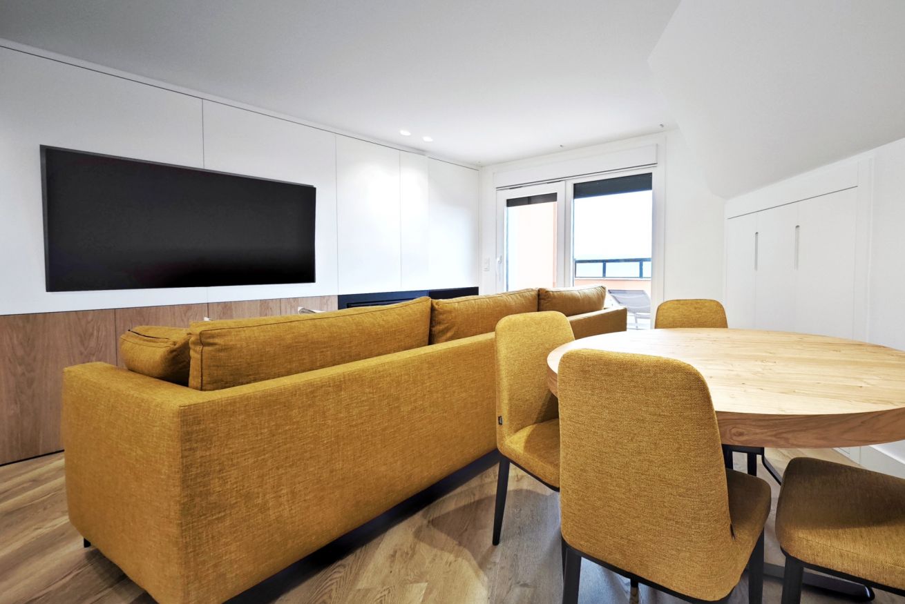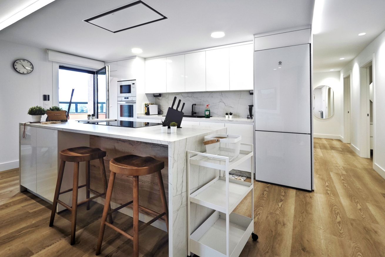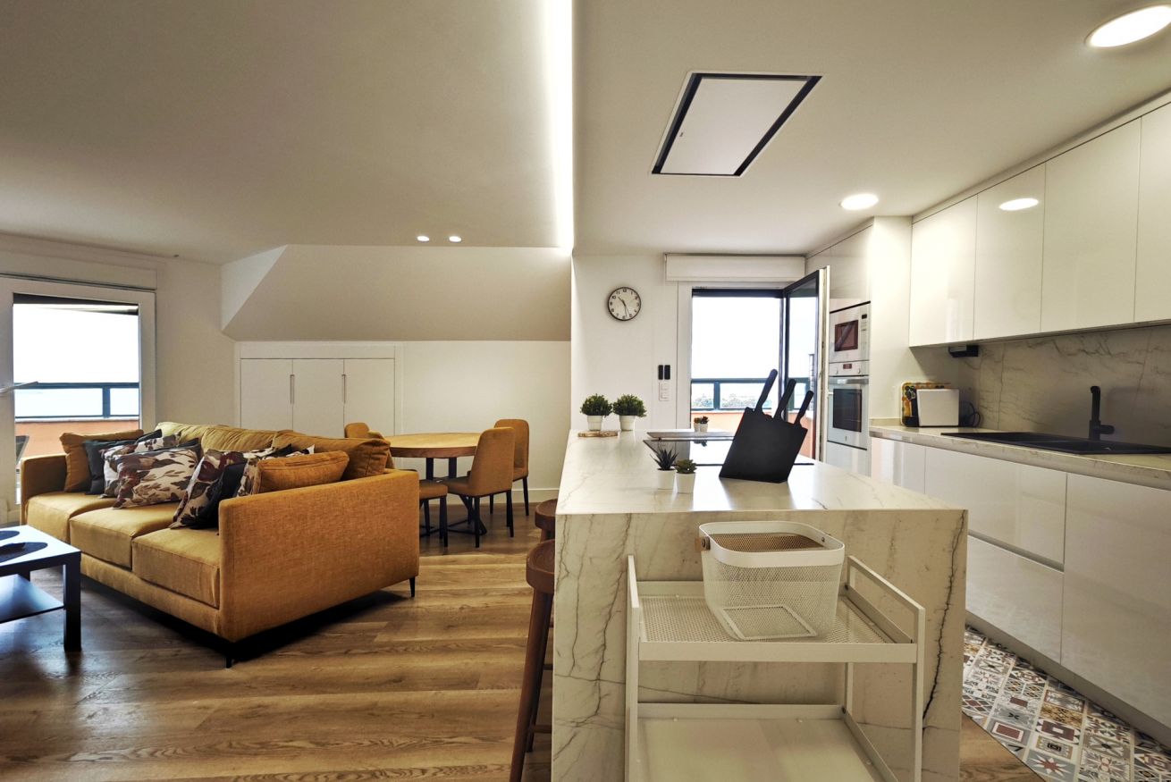 El amplio salón-comedor con grandes ventanales inunda el espacio de luz natural, creando un ambiente acogedor y moderno. La cocina equipada es ideal para preparar deliciosas comidas.